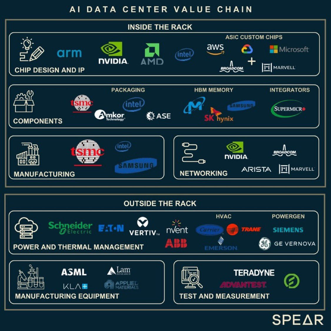 Bref, voici un rĂ©cap synthĂ©tique de la chaine de valeur des data center liĂ©s Ă lâintelligence artificielle.