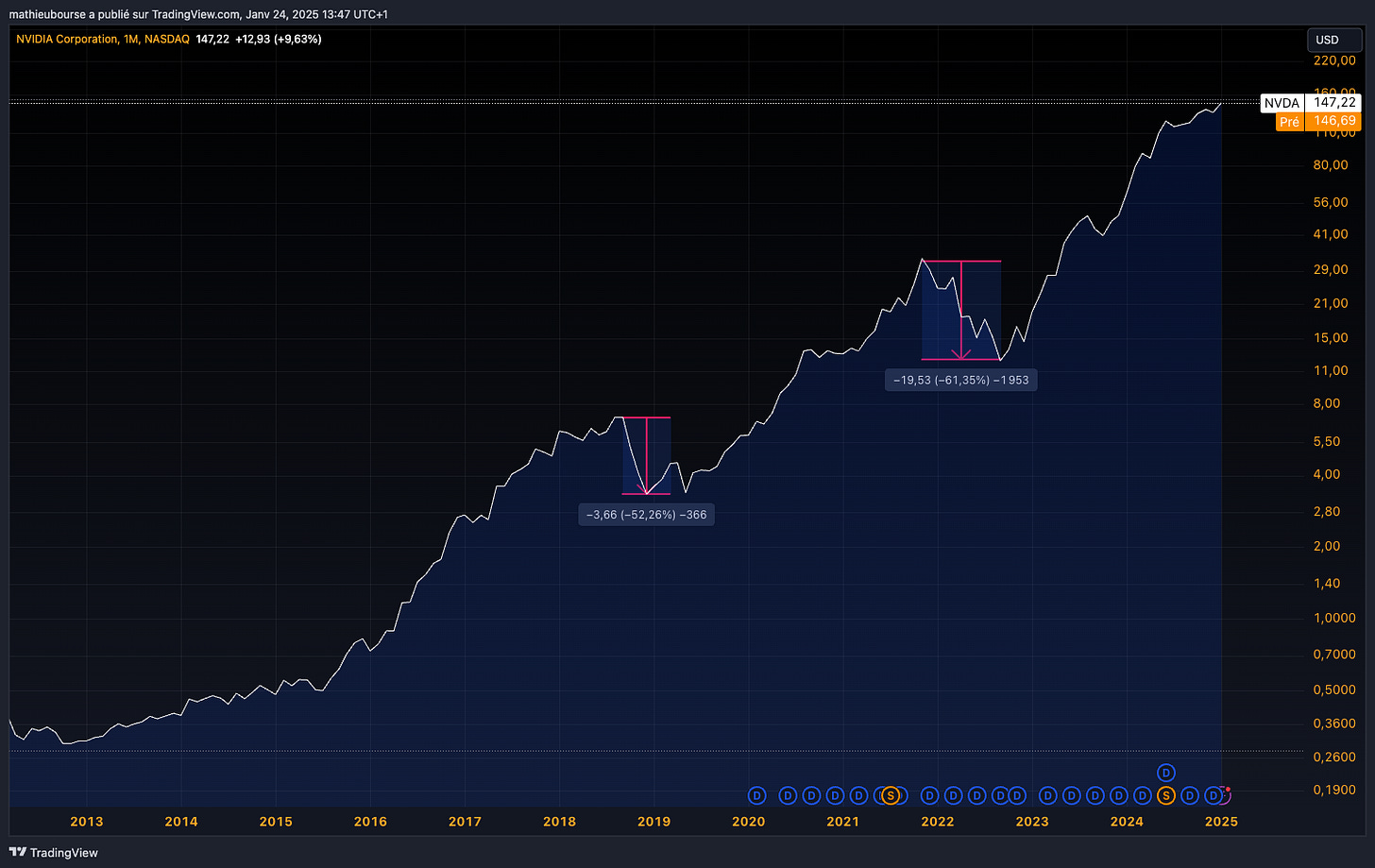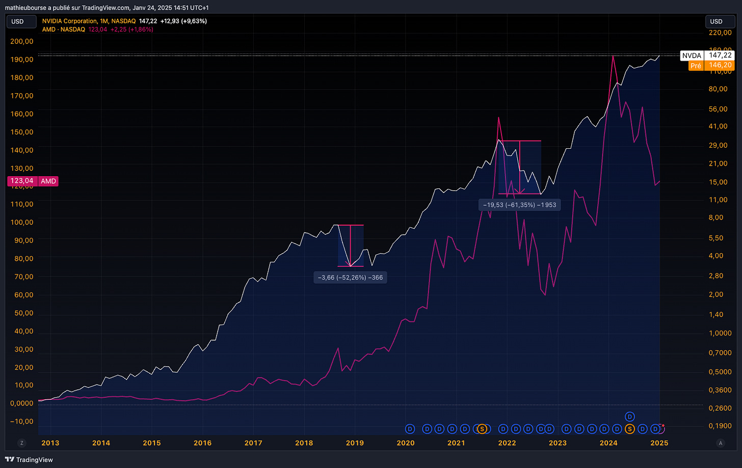 âĄïžâĄïžâĄïž De ce fait, ce que jâestime possible sur Nvidia et AMD, câest un fort trou dâair dâun point de vue demande sur les 2/3 prochaines annĂ©es, qui pourrait se traduire par un fort trou dâair en Bourse, Ă lâimage de ce qui sâest passĂ© fin 2018 (-52%) et fin 2021 dĂ©but 2022 (-61%) sur Nvidia : —ïž