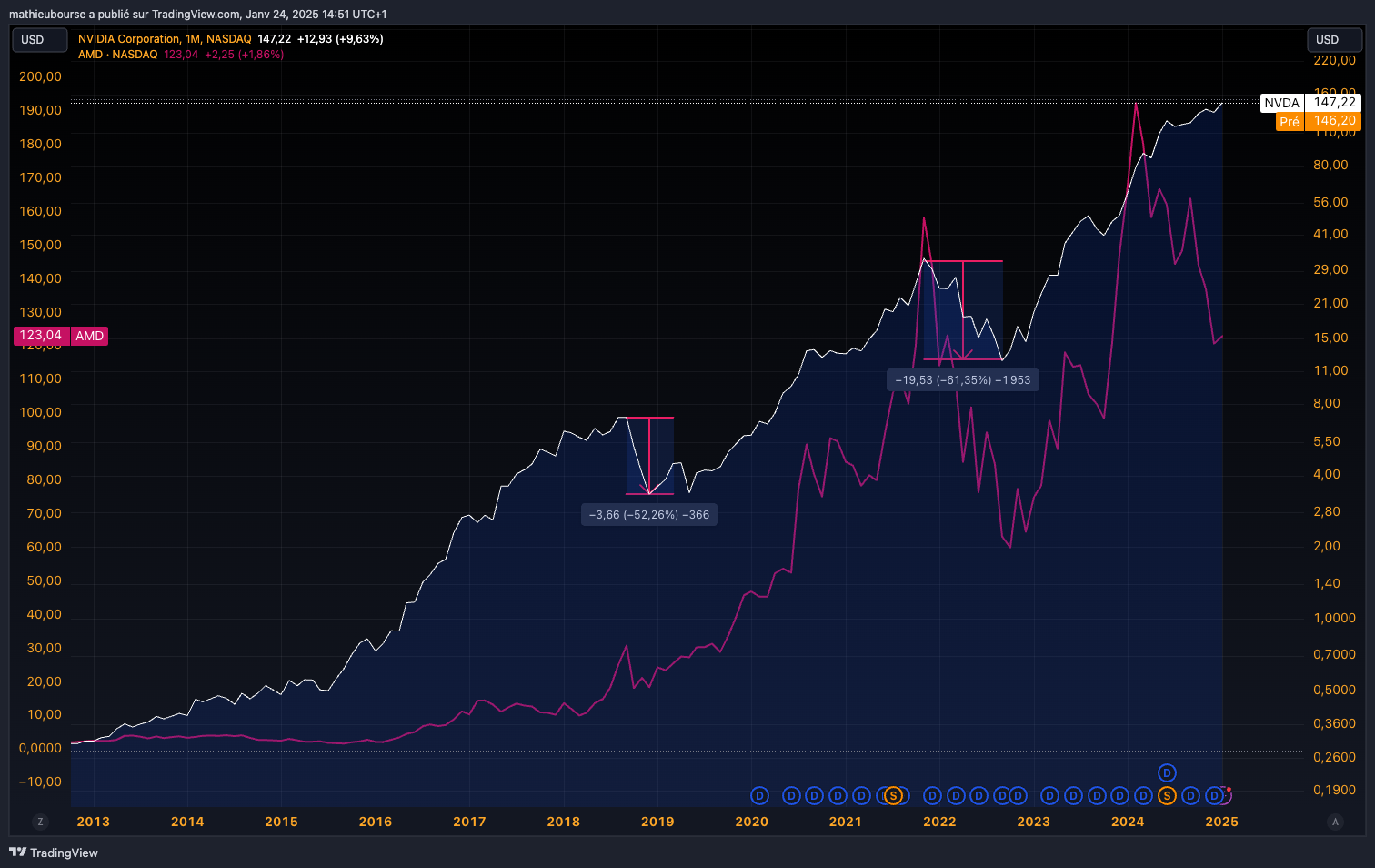 Et concernant AMD⊠elle a souvent suivi Nvidia⊠(courbe rose)