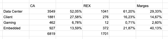 Câest bien la branche Data Center qui explose en ce moment, avec plus de 50% des ventes totales. Cette branche nâest pas la plus rentable du groupe en termes de marges (29%). Câest la branche Embedded avec des marges dâexploitation de 40%. Cependant, au vu de son importance, câest bien la branche Data Center qui est la plus importante pour le groupe, alors quâelle a gĂ©nĂ©rĂ© 61% du rĂ©sultat dâexploitation du groupe sur le 3e trimestre. Les branches clients et gaming sont plus cycliques et ont des marges moins importantes.