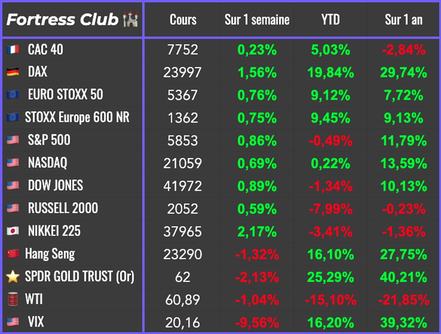 Les marchĂ©s ont fini la semaine dans le vert, mais aprĂšs les espoirs dâavancĂ©es dans les nĂ©gociations Europe/USA, câest justement le manque dâavancĂ©es dans les nĂ©gociations Chine/USA qui a freinĂ© lâoptimisme du marchĂ© vendredi.