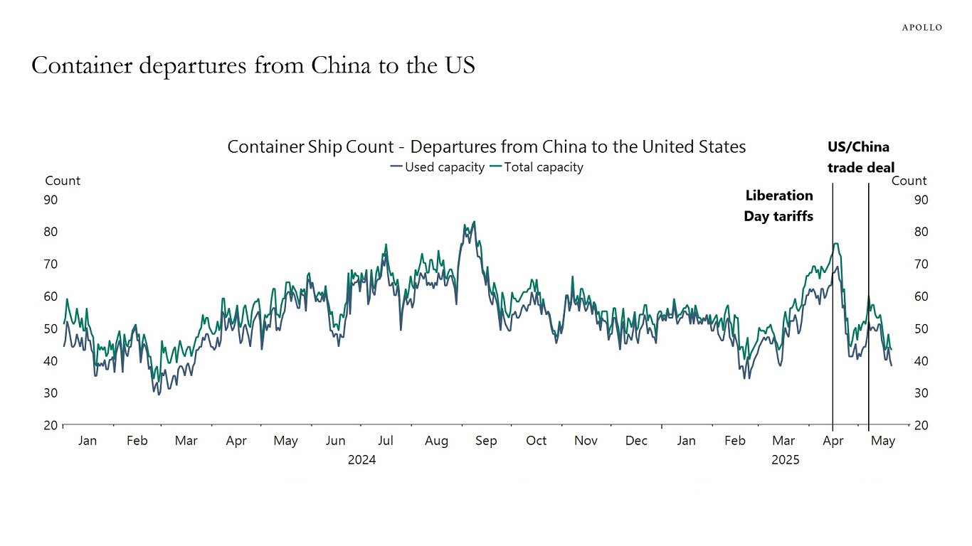 đšđł Pas de reprise du trafic de conteneurs entre les Ătats-Unis et la Chine. PrĂšs de deux semaines aprĂšs l'accord commercial entre la Chine et les Ătats-Unis, le trafic de conteneurs en provenance de Chine vers les Ătats-Unis ne montre toujours pas de vĂ©ritable reprise (voir graphique ci-dessous). Cela soulĂšve deux questions pour Apollo : les droits de douane de 30 % sur les produits chinois restent-ils trop Ă©levĂ©s ? Ou bien les entreprises amĂ©ricaines attendent-elles une Ă©ventuelle nouvelle baisse des tarifs avant d'augmenter leurs expĂ©ditions ? đ Au vu des nĂ©gociations difficiles Chine/USA, on peut comprendre la prudence des entreprises.