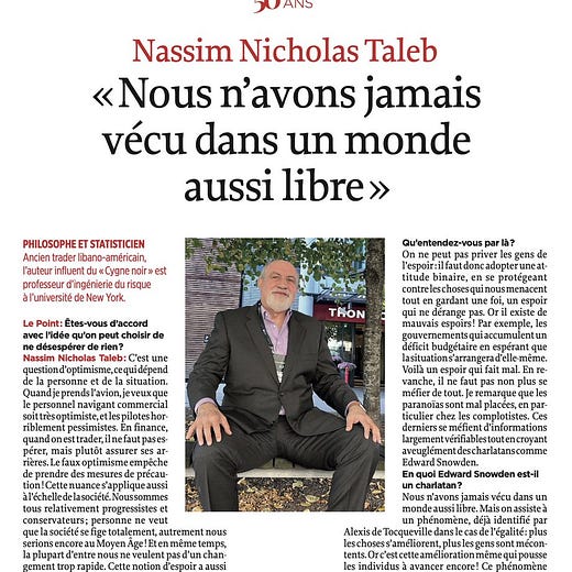 Si vous nâĂȘtes pas abonnĂ© Ă Le Point, voici la derniĂšre interview de Nassim Nicholas Taleb que je vous conseille vivement de lire pour prendre encore plus de hauteur sur les choses.