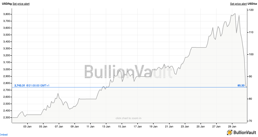 Câest la baisse du prix de lâargent mĂ©tal ce vendredi, aprĂšs une hausse spectaculaire ces derniĂšres semaines. Certains Ă©voquent le fait que des positions avec levier on Ă©tĂ© liquidĂ©es. Dâautres estiment que la nomination Ă la Fed dâun prĂ©sident pas forcement en faveur de baisse de taux est une des raisons qui peut expliquer cette baisse qui est dans le sillage de lâor.