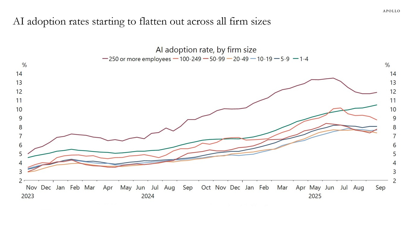 đ€ Les taux dâadoption de lâIA commencent Ă se stabiliser. Les donnĂ©es du Census Bureau et de Ramp montrent que les taux dâadoption de lâIA commencent Ă se tasser pour toutes les tailles dâentreprises. đ Signe que pour le moment, beaucoup nâarrivent pas Ă lâutiliser ?