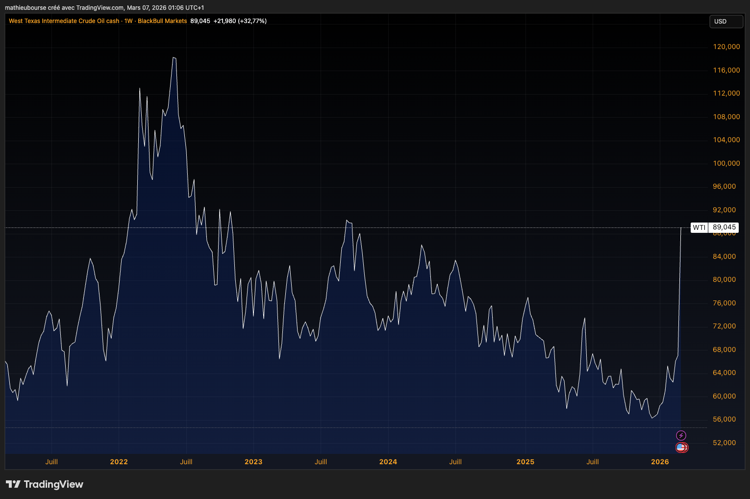 Câest le pic atteint cette semaine par le baril de pĂ©trole WTI.