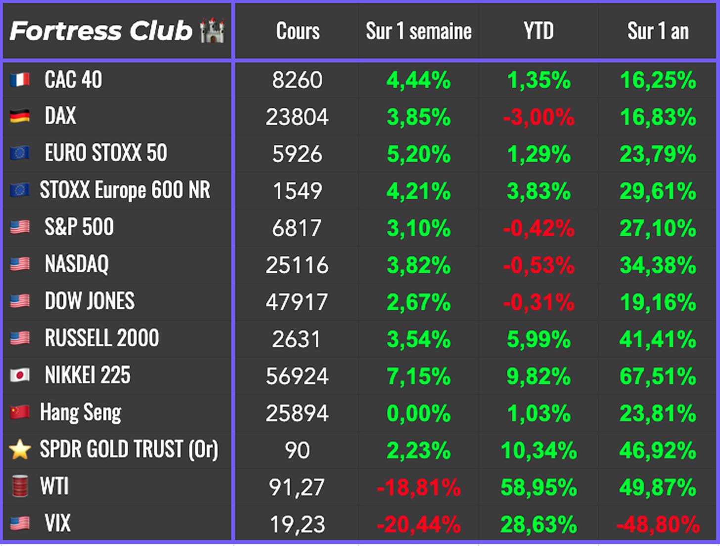 Cette semaine, la hausse des marchĂ©s sâexplique avant tout par un changement de narratif autour du risque gĂ©opolitique, avec lâintĂ©gration dâun scĂ©nario de dĂ©sescalade partielle au Moyen-Orient. Lâannonce dâun cessez-le-feu temporaire et la perspective dâune rĂ©ouverture du dĂ©troit dâOrmuz ont mĂ©caniquement rĂ©duit la prime de risque sur lâĂ©nergie, ce qui a soutenu les actions.