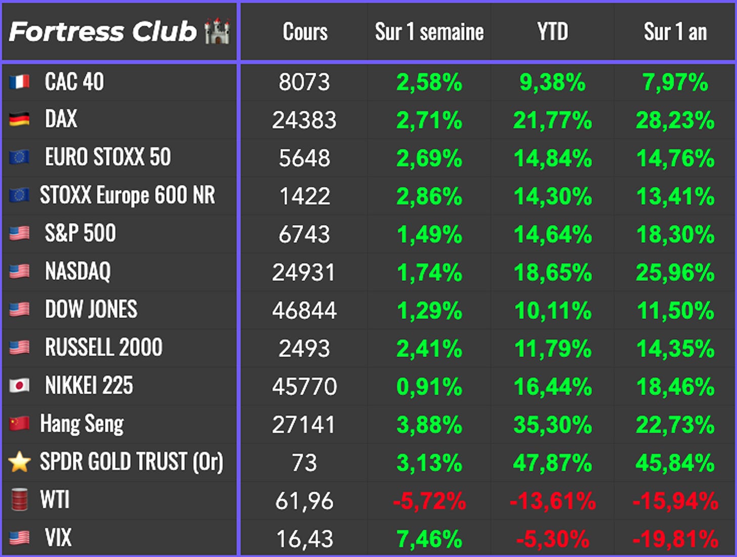 Cette semaine, les marchĂ©s ont progressĂ© grĂące Ă la perspective dâune baisse prochaine des taux dâintĂ©rĂȘt aux Ătats-Unis. Les statistiques de lâemploi ont montrĂ© un affaiblissement inattendu, ce qui alimente lâidĂ©e que la Fed pourrait assouplir sa politique monĂ©taire. ParallĂšlement, les nombreuses annonces dans le domaine de lâintelligence artificielle entretiennent lâintĂ©rĂȘt des investisseurs. Enfin, certains secteurs en retard comme la pharmacie, le luxe ou lâautomobile ont retrouvĂ© des couleurs.