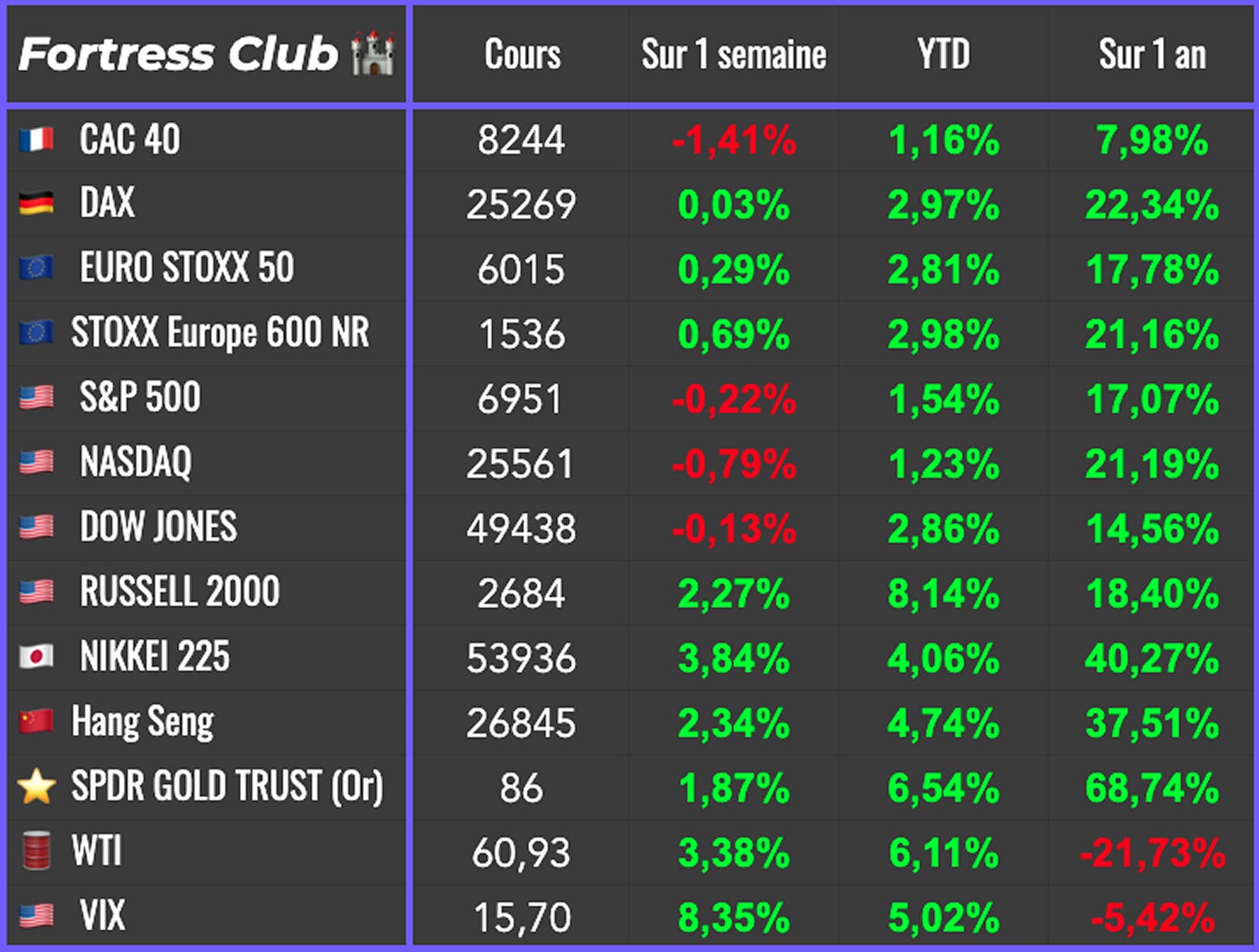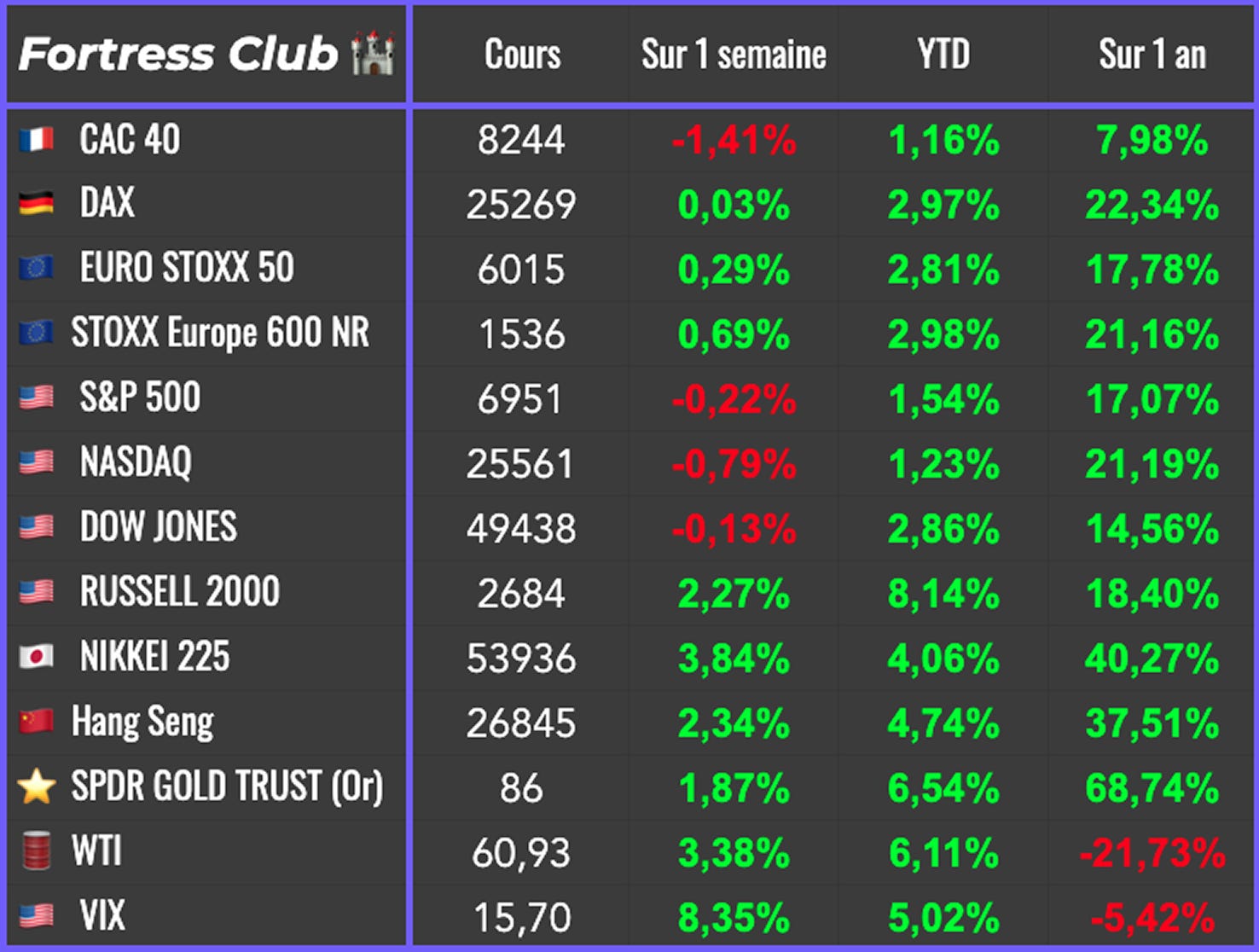 Lâinflation amĂ©ricaine est ressortie lĂ©gĂšrement en dessous des attentes pour le mois de dĂ©cembre, sans provoquer lâeffet dâentraĂźnement que certains espĂ©raient. Le marchĂ© reste convaincu quâil nây aura pas dâautre baisse de taux dâici au dĂ©part de Jerome Powell en juin prochain, ce qui limite la portĂ©e de la statistique. Cette publication a bien soutenu briĂšvement la cote, mais lâambiance sâest vite dĂ©gradĂ©e. JPMorgan a pourtant livrĂ© des rĂ©sultats solides, mais le projet de Donald Trump de plafonner les taux des cartes de crĂ©dit a crispĂ© le secteur bancaire. Câest la seconde intervention de ce type en moins dâune semaine, aprĂšs celle visant lâimmobilier rĂ©sidentiel, et elle renforce le malaise dans les milieux dâaffaires, dĂ©jĂ sensibles Ă la pression exercĂ©e sur la politique monĂ©taire de la Fed.