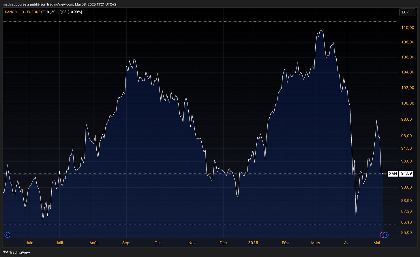 đŻ Jâai une optique de court-moyen terme sur le titre. Je suis lĂ essentiellement pour jouer des rebond du titre vers les 100/105âŹ. Je reviendrais du coup Ă lâachat sur Sanofi dĂšs que le titre aura davantage baissĂ© ou que jâaurais la conviction que Trump mettra de lâeau dans son vin sur le prix des mĂ©dicaments aux US.