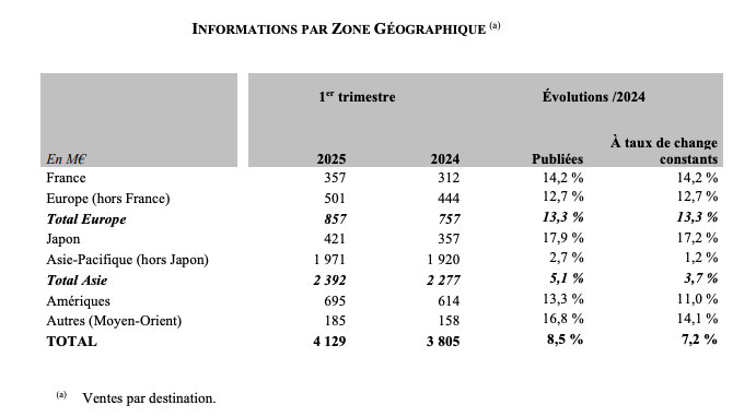 Ce positionnement trĂšs haut gamme sâillustre par le fait que mĂȘme en Asie, les ventes du groupe se portent bien, contrairement Ă la plupart des acteurs du luxe qui subissent un ralentissement plus marquĂ© sur cette zone.