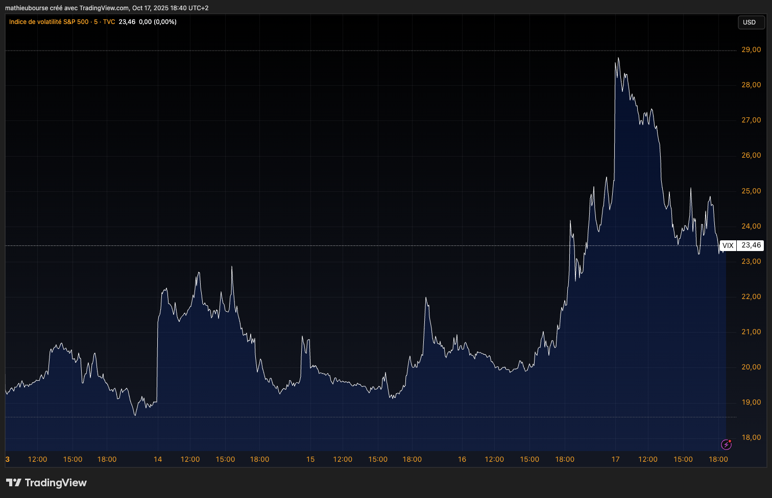 La nervositĂ© sâest traduite par une hausse de lâindice de volatilitĂ© VIX, dĂ©sormais autour de 24, un niveau inĂ©dit depuis avril. Ce retour de tension intervient alors que les investisseurs sâinterrogent sur la soliditĂ© de la bulle autour de lâintelligence artificielle et cherchent des occasions de sĂ©curiser leurs gains rĂ©cents. Câest aussi un signe du manque de liquiditĂ© sur certains marchĂ©s et dâune mauvaise anticipation dâune rĂ©surgence des risques, en lâoccurence liĂ©s Ă la guerre commerciale et aux banques US.
