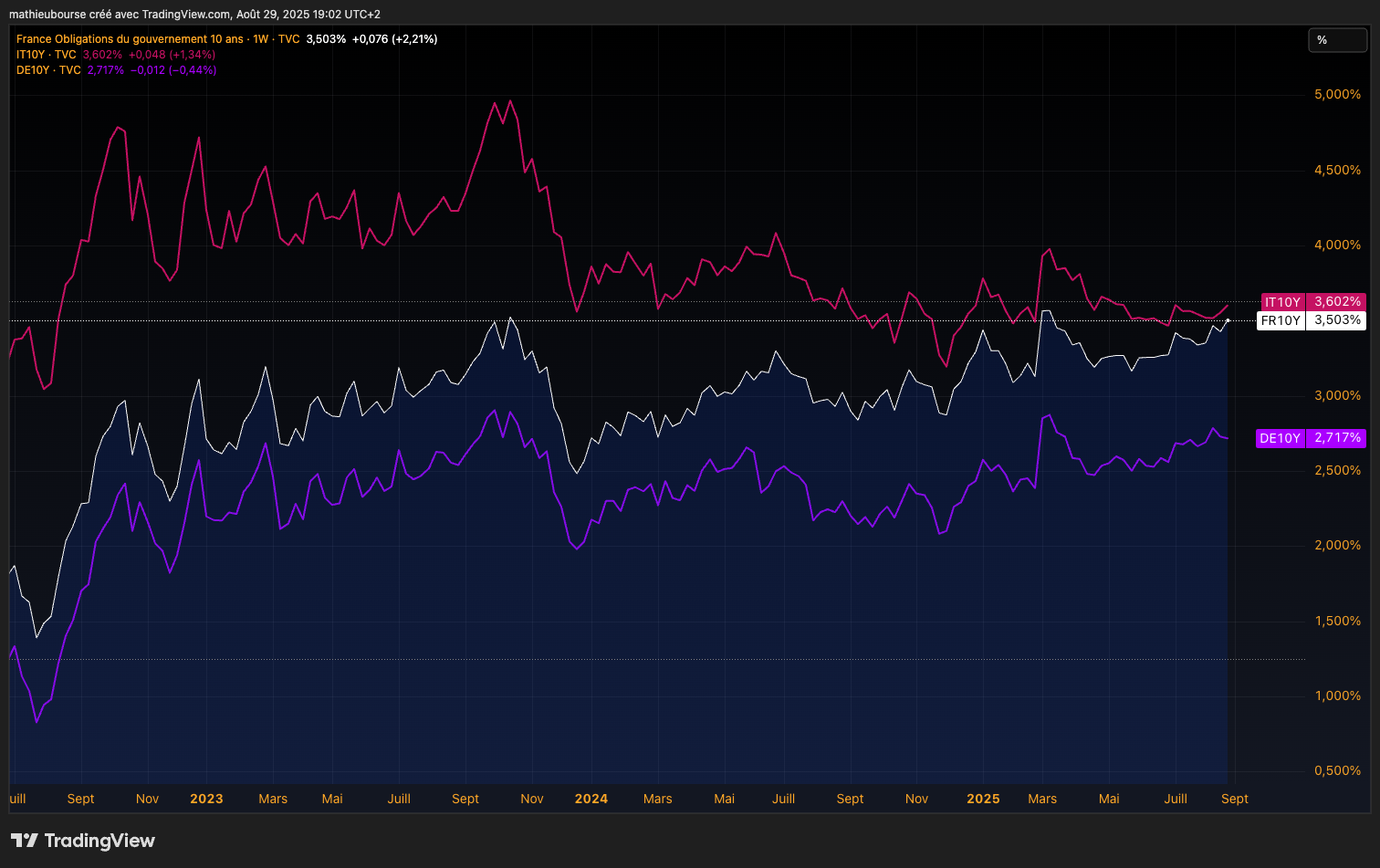 Cette perte de confiance envers la France est Ă©galement visible sur le marchĂ© obligataire. Le rendement Ă 10 ans des OAT est quasiment au mĂȘme niveau que le 10 ans du gouvernement italien⊠et lâĂ©cart se creuse avec lâAllemagne.