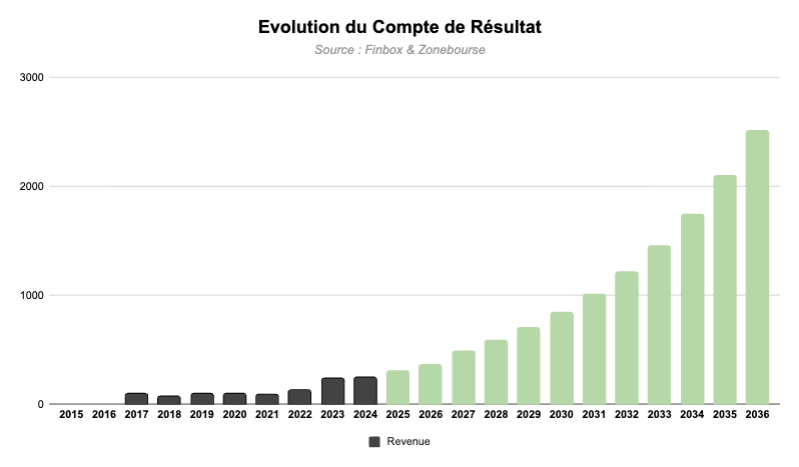 Avec un multiple de 8x les ventes, on aurait une capitalisation de 2,1 Mds$ (vs 231 M$ à ce jour) en 2036, soit + 809 % de hausse, soit un rendement annualisé de +24,70 % sur 10 ans.
