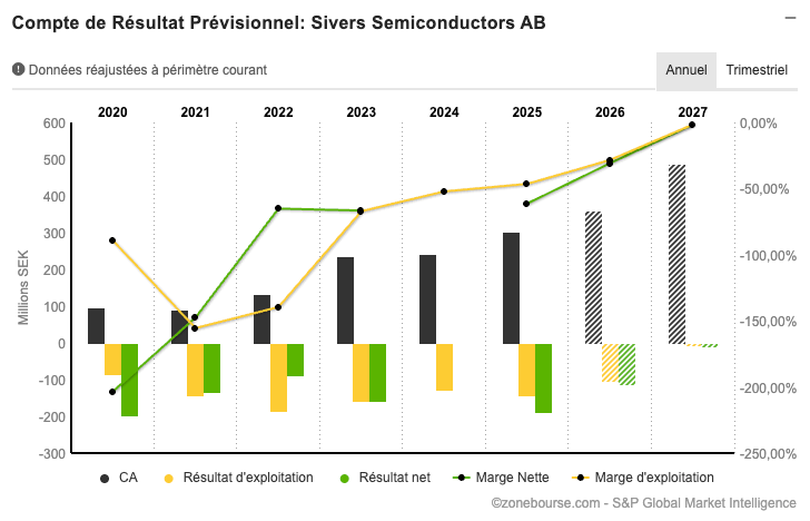 La dynamique de croissance est bien orientée, mais la rentabilité reste en construction. En 2025, Sivers affiche un EBITDA ajusté négatif, légèrement supérieur à –10 MSEK (environ –1 M$), encore en perte mais en amélioration d’environ 30 % par rapport à 2024. Le management met en avant l’effet de levier lié à la progression des volumes, l’augmentation de la part des revenus de produits et un meilleur mix entre Wireless et Photonics pour expliquer cette amélioration. Le groupe reste cependant déficitaire au niveau de l’EBIT, ce qui reflète une phase d’investissement soutenu en R&D pour se positionner sur des marchés qui sont encore en phase de qualification, mais qui peuvent devenir massifs si l’optique intégrée se généralise.