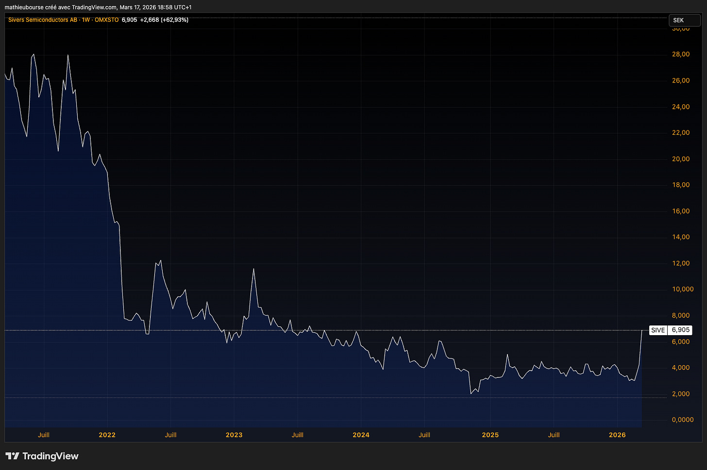 ✅ Bref, j’ai ouvert lundi 16 mars une position en Sivers Semiconductors de 2% (PRU 0,62€) dans le portefeuille PEA. C’est une valeur plus risquée que la moyenne, un pari sur l’avenir. De ce fait, il y a peu de chance que je renforce cette position. Elle doit rester un petite position pour le moment. Cependant, si son potentiel se matérialise, elle contribuera de façon importante à la performance du portefeuille. Mon horizon avec cette valeur est de 3 à 5 ans pour débuter, mais de 10 ans si ça avance bien !