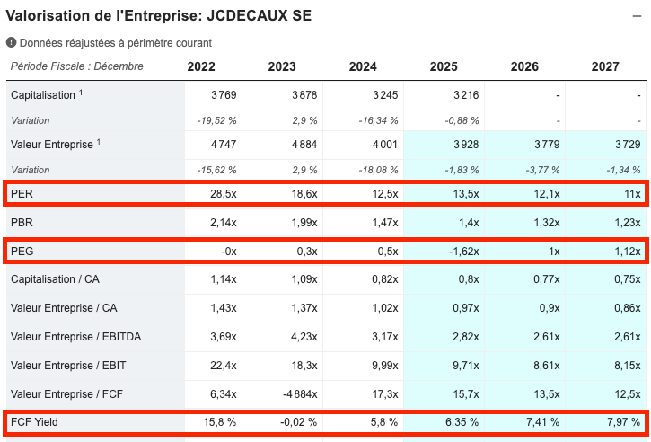 ✅ Ainsi, si vous cherchez une belle midcap familiale (le côté familial se ressent dans la gestion rigoureuse des coûts et dans la poursuite des investissements au détriment d’une meilleure rentabilité), je pense que JCDecaux est une valeur de choix pour un PEA sur les trois à quatre prochaines années. Mon objectif à trois ou quatre ans est assez prudent, car en réalité, les marges pourraient s’améliorer plus fortement en raison d’une meilleure rentabilité à terme des activités digitale, via un ralentissement proportionnel des investissements, mais aussi d’un effet de levier opérationnel plus important avec un rebond de l’activité.